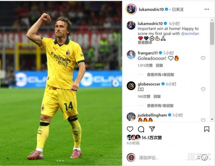 莫德里奇社媒晒出比赛相片,并写谈:“在主场获取紧迫胜仗!很欢笑攻入我在米兰的首粒进球的。”