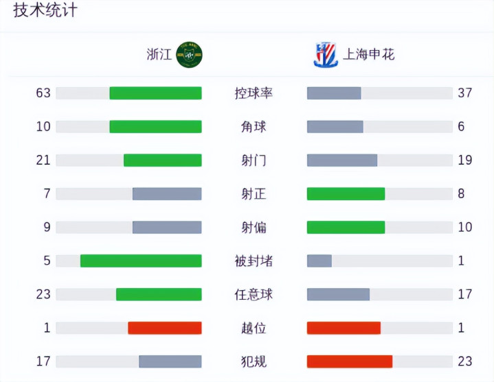 这场比赛,上海申花从神色到成果,齐无法让东谈主惬意。赛后数据显现,上海申花靠近浙江队,尽然全面处于瑕玷,控球率唯一37%,角球比浙江队少4个,射门次数、传球顺利率以及落拓球次数,齐不如浙江队。从数据统计看,上海申花最终能1:1战平浙江,不仅不应该感到缺憾,还应该感到运道。