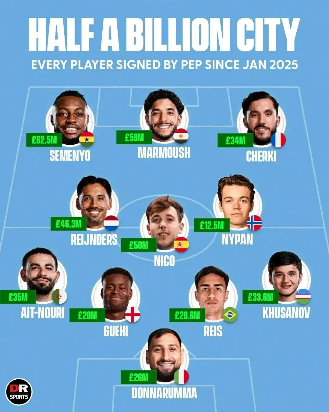据《转会市集》统计披露,曼城自2025年1月以来在转会市集总投资高达4.8亿欧元,所有这个词引进了14名新援。而这些新援完好意思大要构成一套英超实力苍劲的首发威望: