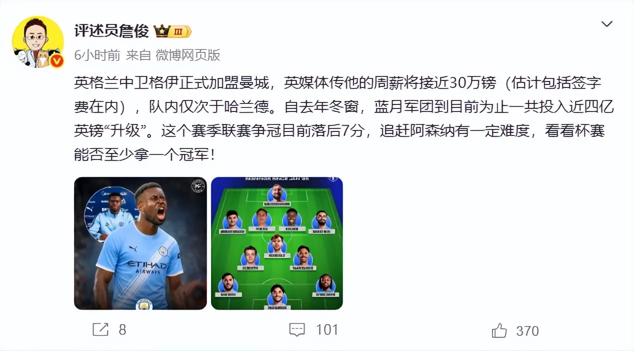 关于曼城在转会市集的强势发扬,着名清楚注解员詹俊在个东谈主酬酢媒体点评谈:“自旧年冬窗体育最新信息,蓝月军团到当今完毕一共干涉近四亿英镑“升级”。这个赛季联赛争冠当今过时7分,追逐阿森纳有一定难度,望望杯赛能否至少拿一个冠军! ”